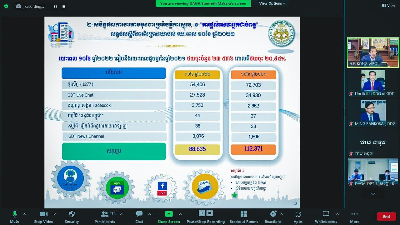 លោកបន្តថា អគ្គនាយកដ្ឋានពន្ធដារ បានពិគ្រោះយោបល់ ជូនអ្នកជាប់ពន្ធតាម Call Center 1277, GDT Live Chat, Facebook, E-Mail, GDT News Channel និង ពិគ្រោះយោបល់ដោយផ្ទាល់ សរុបចំនួន ៨៨ ៨៣៥ ករណី សម្រាប់រយៈពេល ១០ខែ ឆ្នាំ២០២២ និងបានផ្តល់សេវាគាំទ្រការប្រើប្រាស់ប្រព័ន្ធ និងកម្មវិធីនានា (E-Tax Service) ដោះស្រាយរាល់បញ្ហាប្រឈមនានា ក្នុងការប្រើប្រាស់ ប្រព័ន្ធនិងកម្មវិធីនានាតាមប្រព័ន្ធអនឡាញសរុបចំនួន ២៣ ១៧៩ ករណី សម្រាប់រយៈពេល ១០ខែ ឆ្នាំ២០២២។